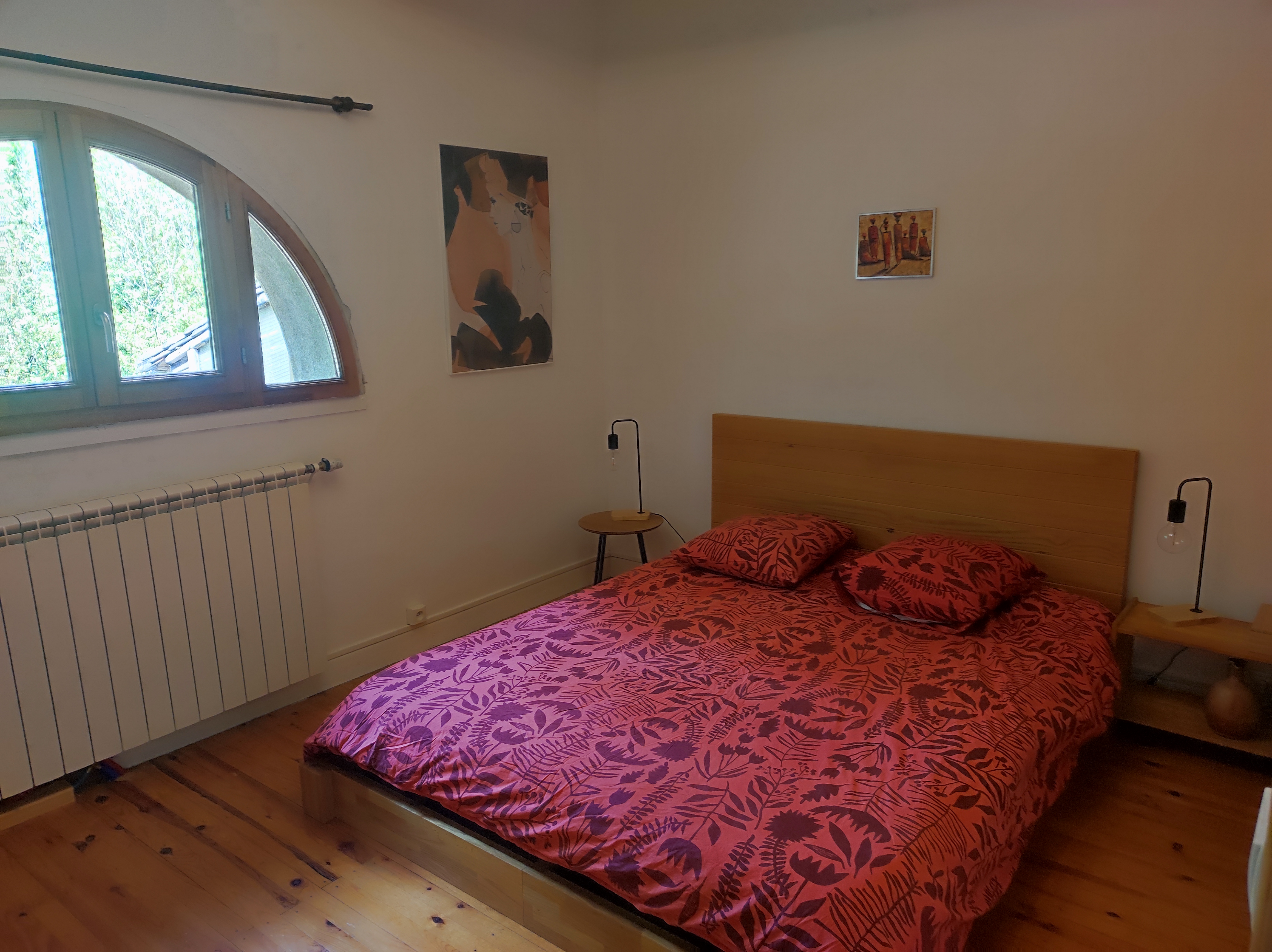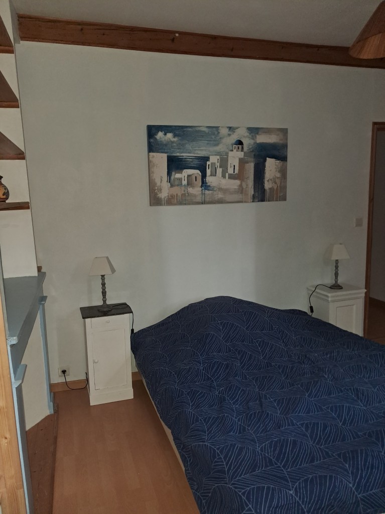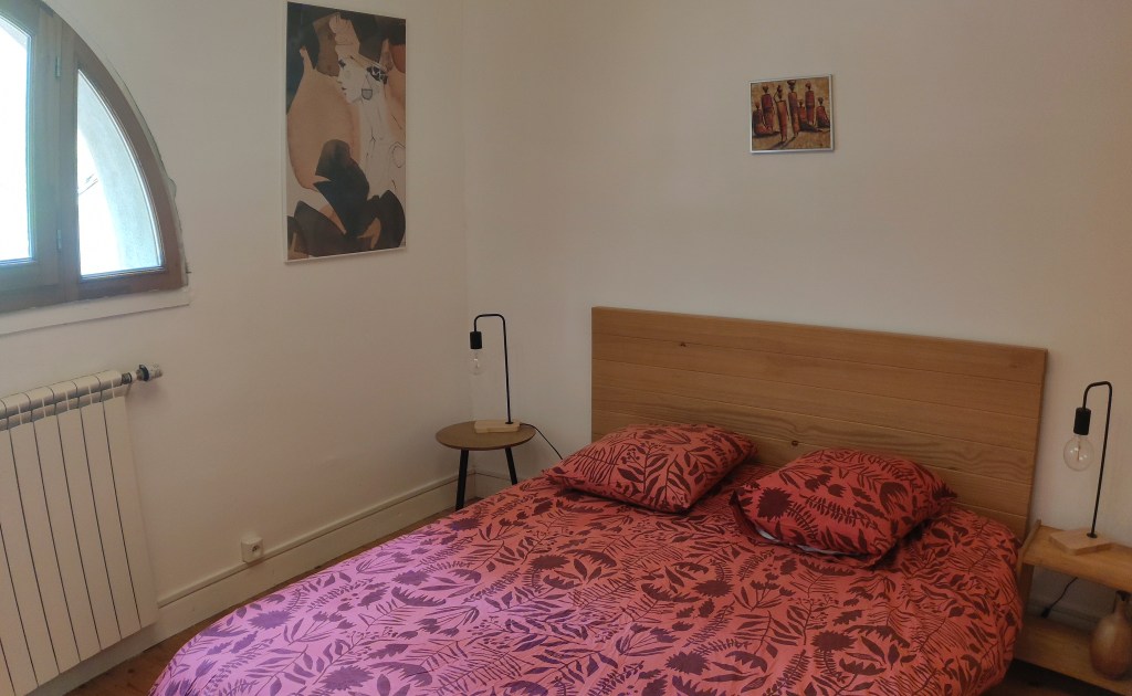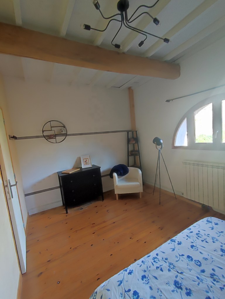 En toute simplicité, dans un cadre de campagne calme, une chambre et salle de bain attenante rénovée avec des matériaux naturels (chaux, bois, terre).
